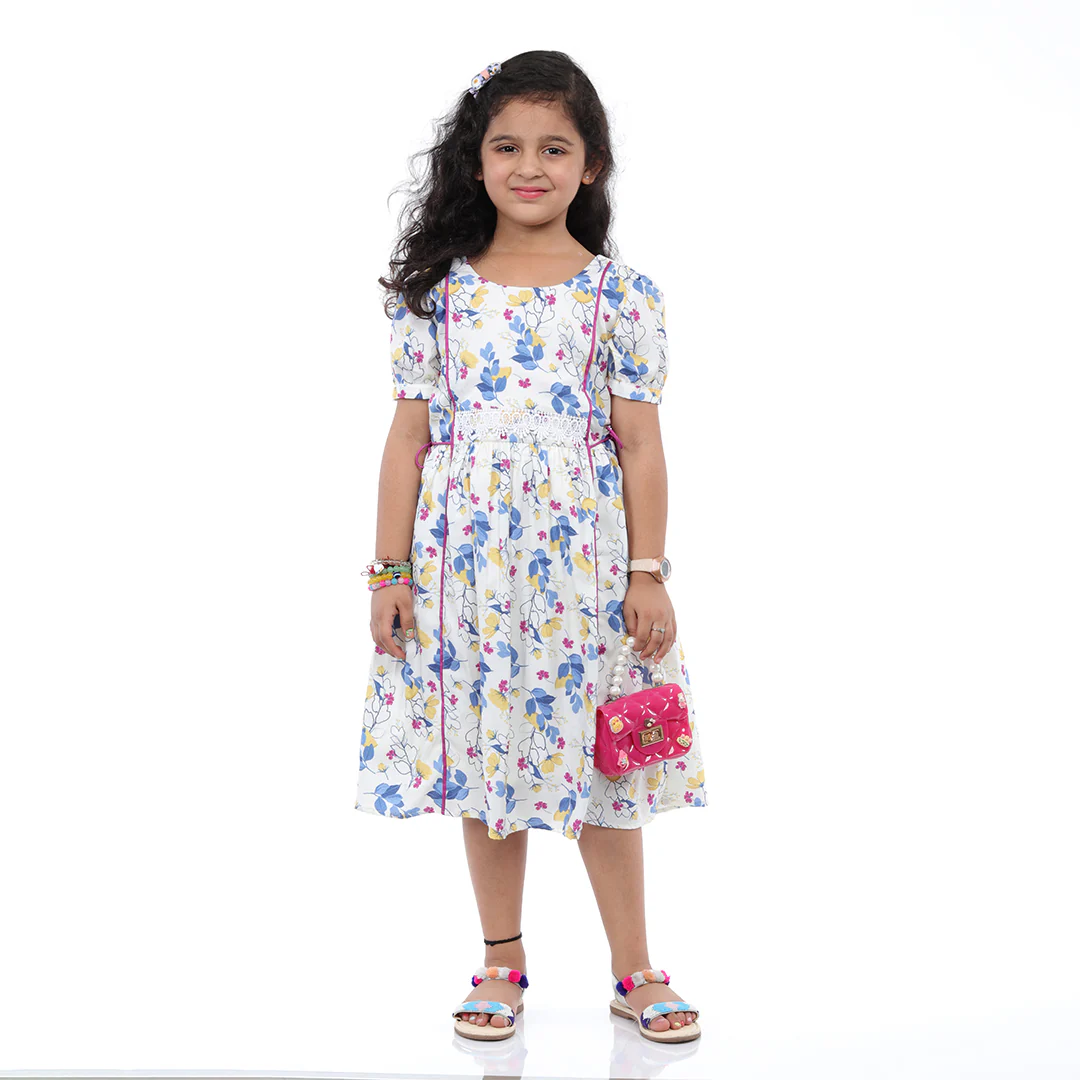 Brighten your child’s wardrobe with the Floral Fantasy Midi Dress, perfect for everyday wear and special occasions. Featuring a vibrant floral pattern in shades of blue, yellow, and pink, this dress combines style and comfort effortlessly.